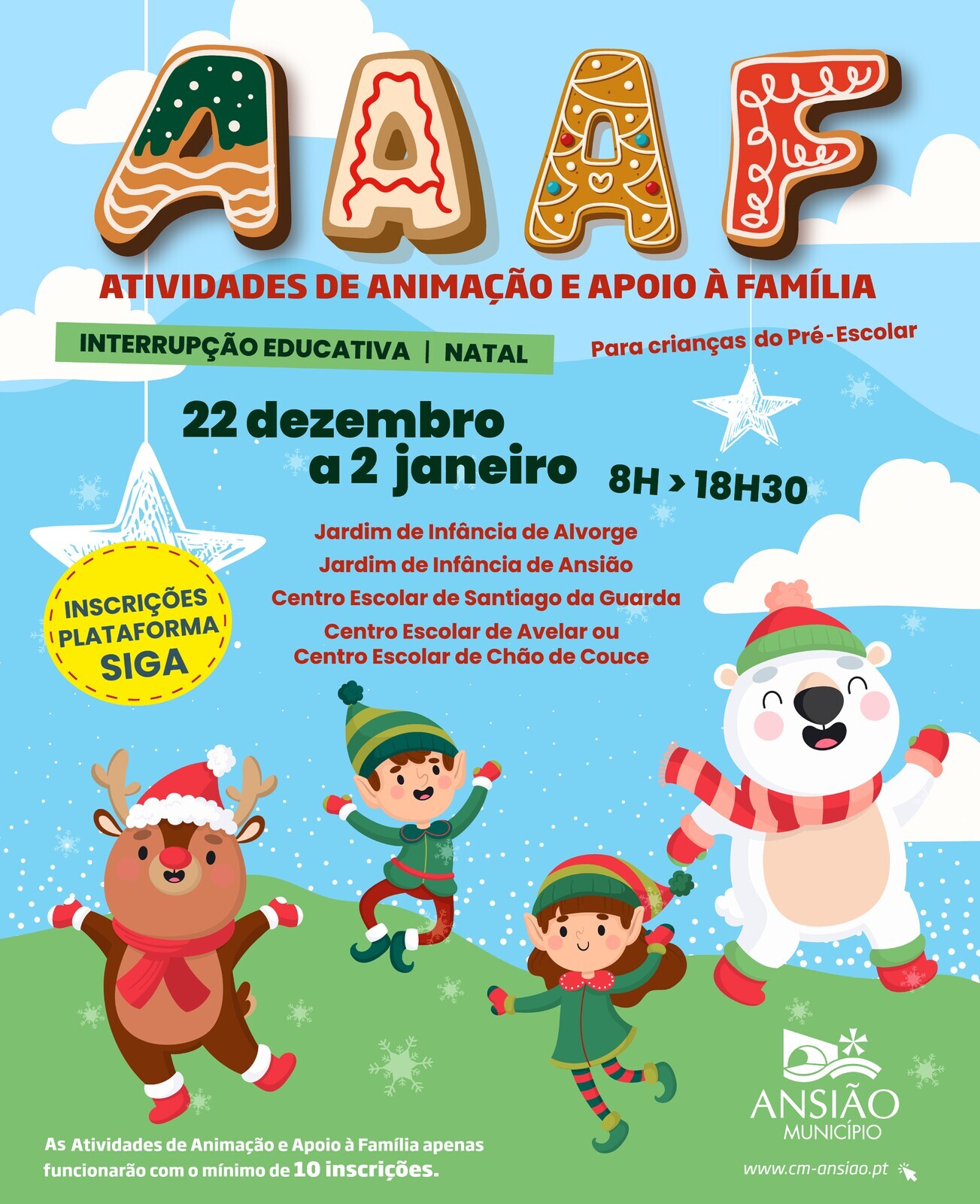O Município de Ansião, no âmbito das suas competências na área da educação, procurando dar resposta às necessidades dos agregados familiares, irá assegurar as Atividades de Animação e Apoio à Família (AAAF), que decorrerão de 22 de dezembro de 2025 a 02 de janeiro de 2026, no Jardim de Infância de Alvorge, Jardim de Infância de Ansião, no Centro Escolar de Santiago da Guarda e no Centro Escolar de Chão de Couce ou Centro Escolar de Avelar.