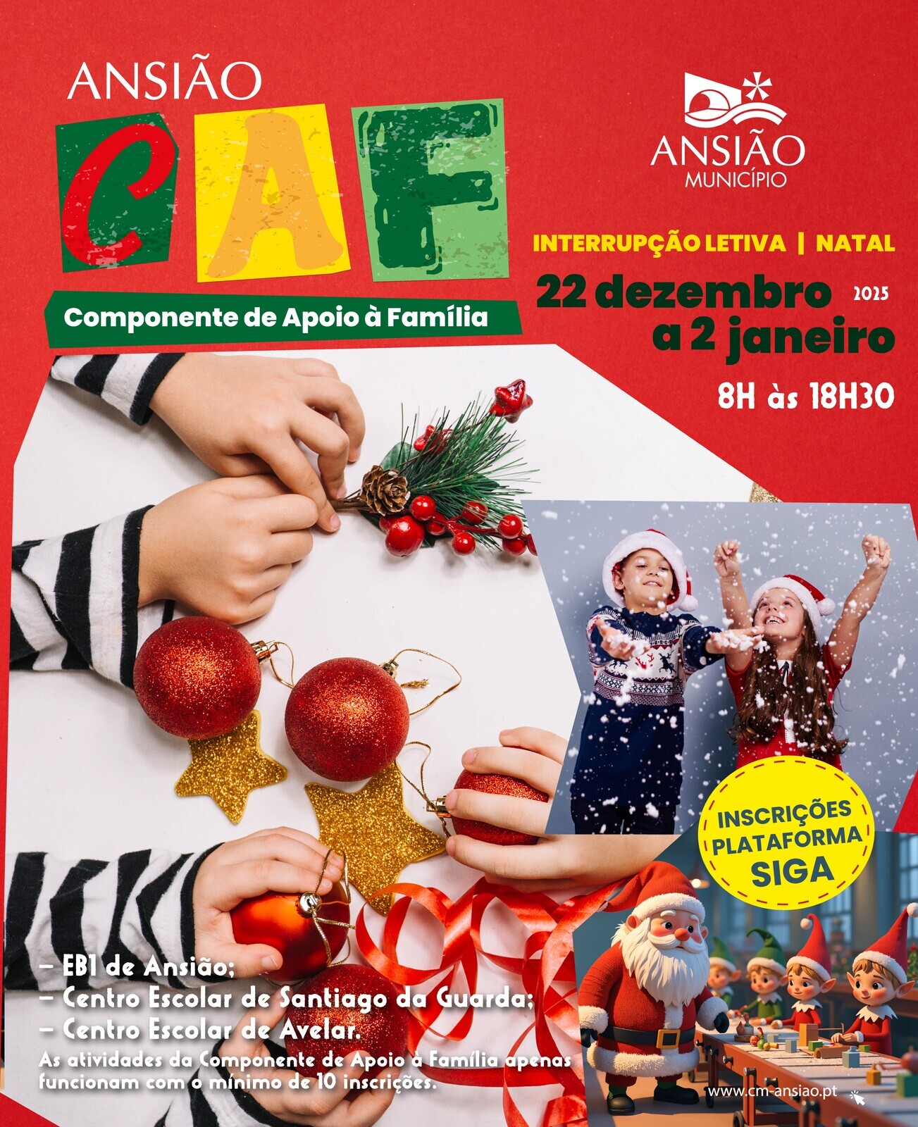 O Município de Ansião, no âmbito das suas competências na área da educação, procurando dar resposta às necessidades dos agregados familiares, irá assegurar a Componente de Apoio à Família (CAF), que decorrerá de 22 de dezembro de 2025 a 02 de janeiro de 2026, no Centro Escolar de Santiago da Guarda, EB1 de Ansião e Centro Escolar de Avelar.