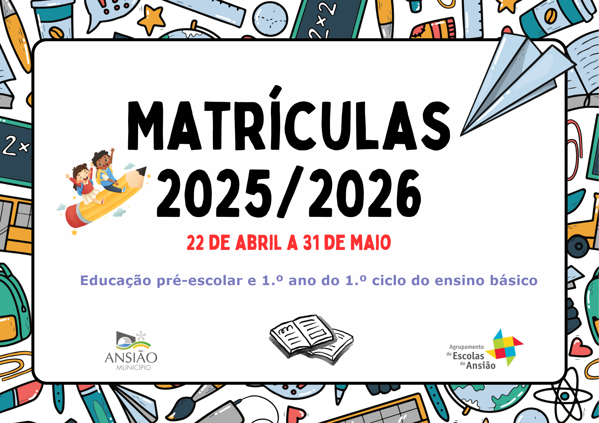Informam-se os Encarregados de Educação que se encontram abertas as matrículas e inscrições nas modalidades de apoio de componente municipal, para o ano letivo 2025/2026, para as crianças da educação pré-escolar e alunos do 1º ano do ensino básico.