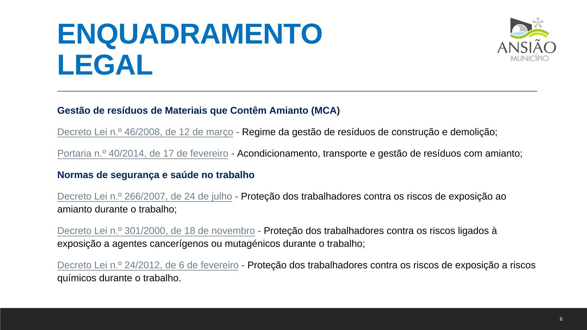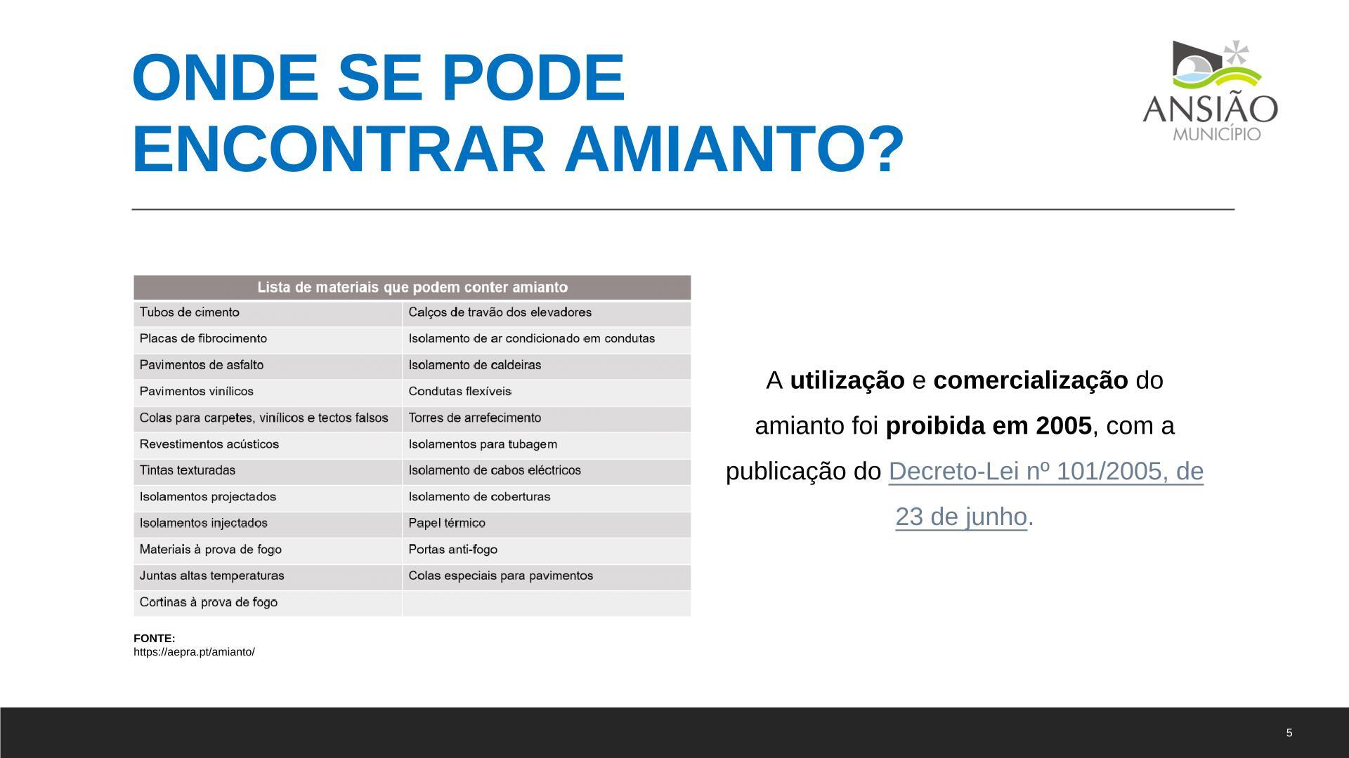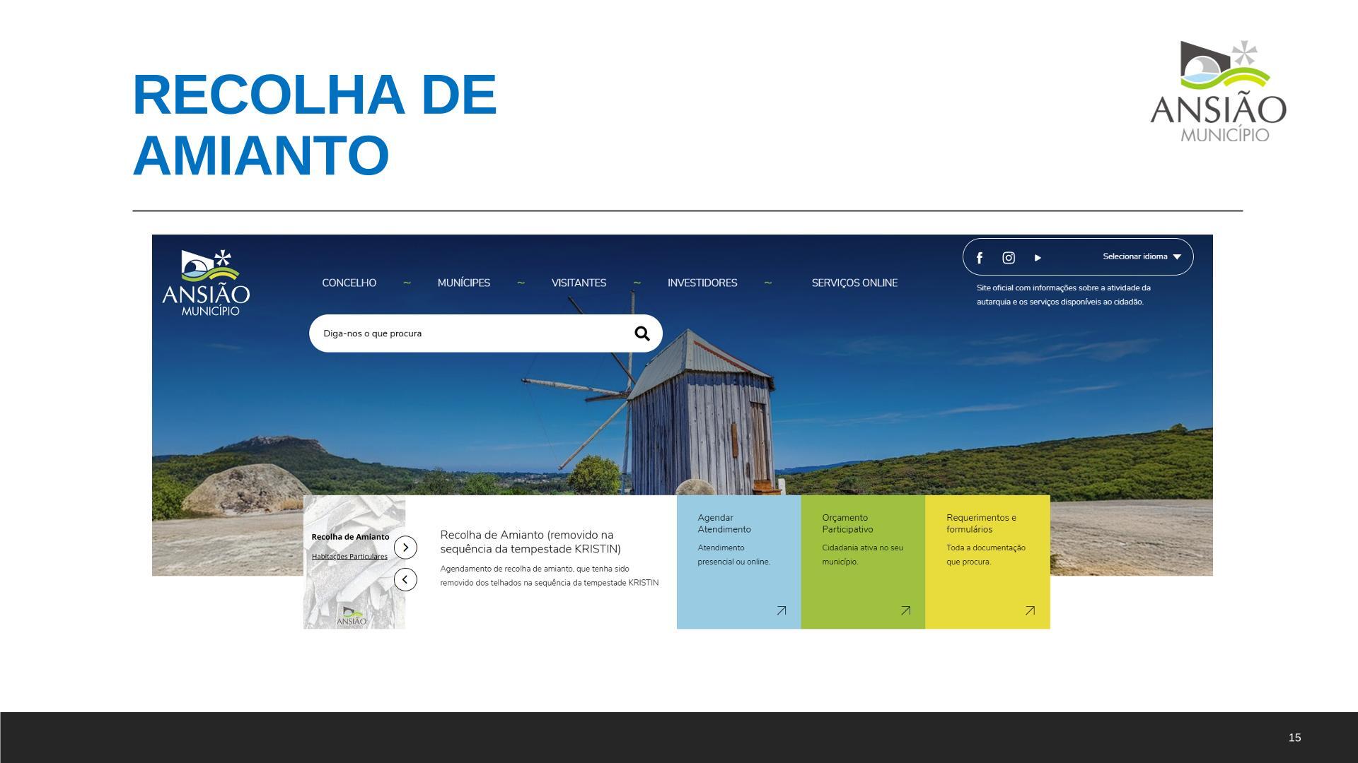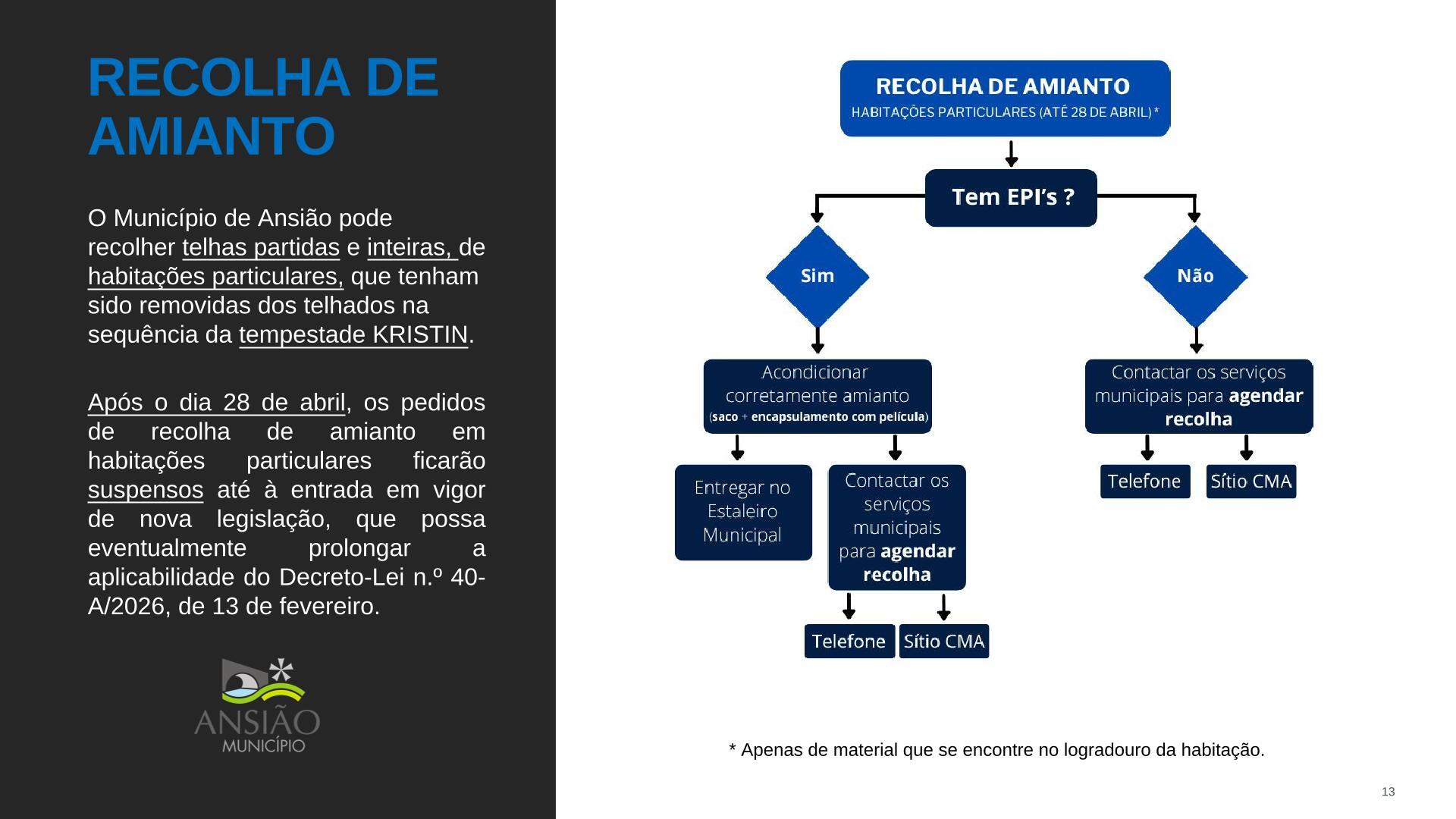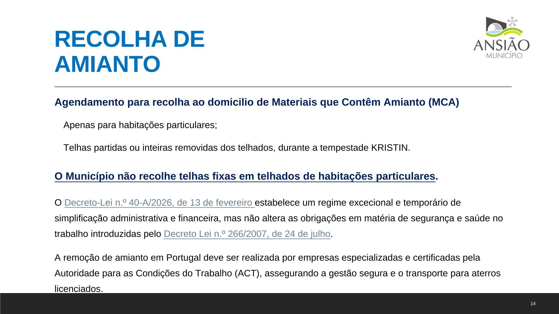 - A existência, até 28 de abril, de um contentor específico para recolha deste material, no Parque Logístico Municipal, mais conhecido como estaleiro, e de um formulário online para agendamento da recolha destes materiais, em habitações particulares.