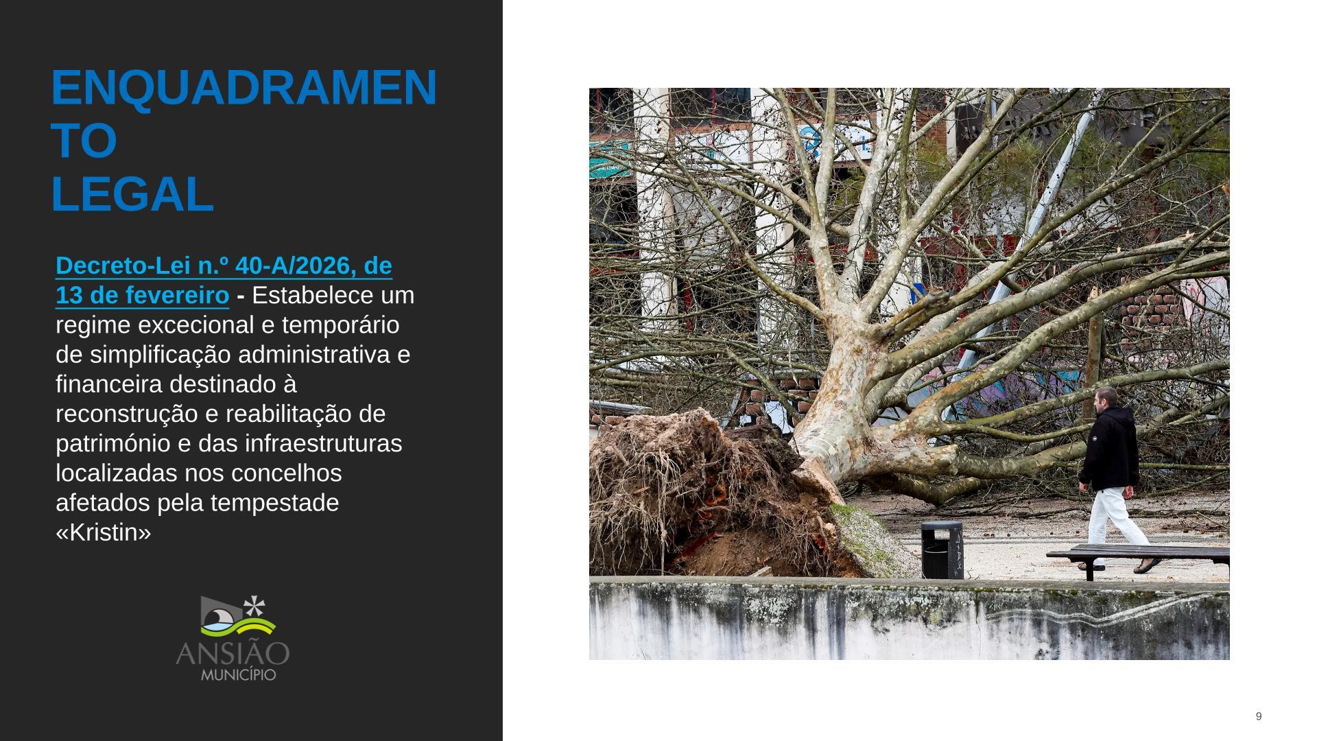 - O plano legal, concretamente o enquadramento em vigor, que estabelece um regime excecional e temporário de simplificação administrativa e financeira, no âmbito da reconstrução e reabilitação de património e infraestruturas afetadas pela intempérie;