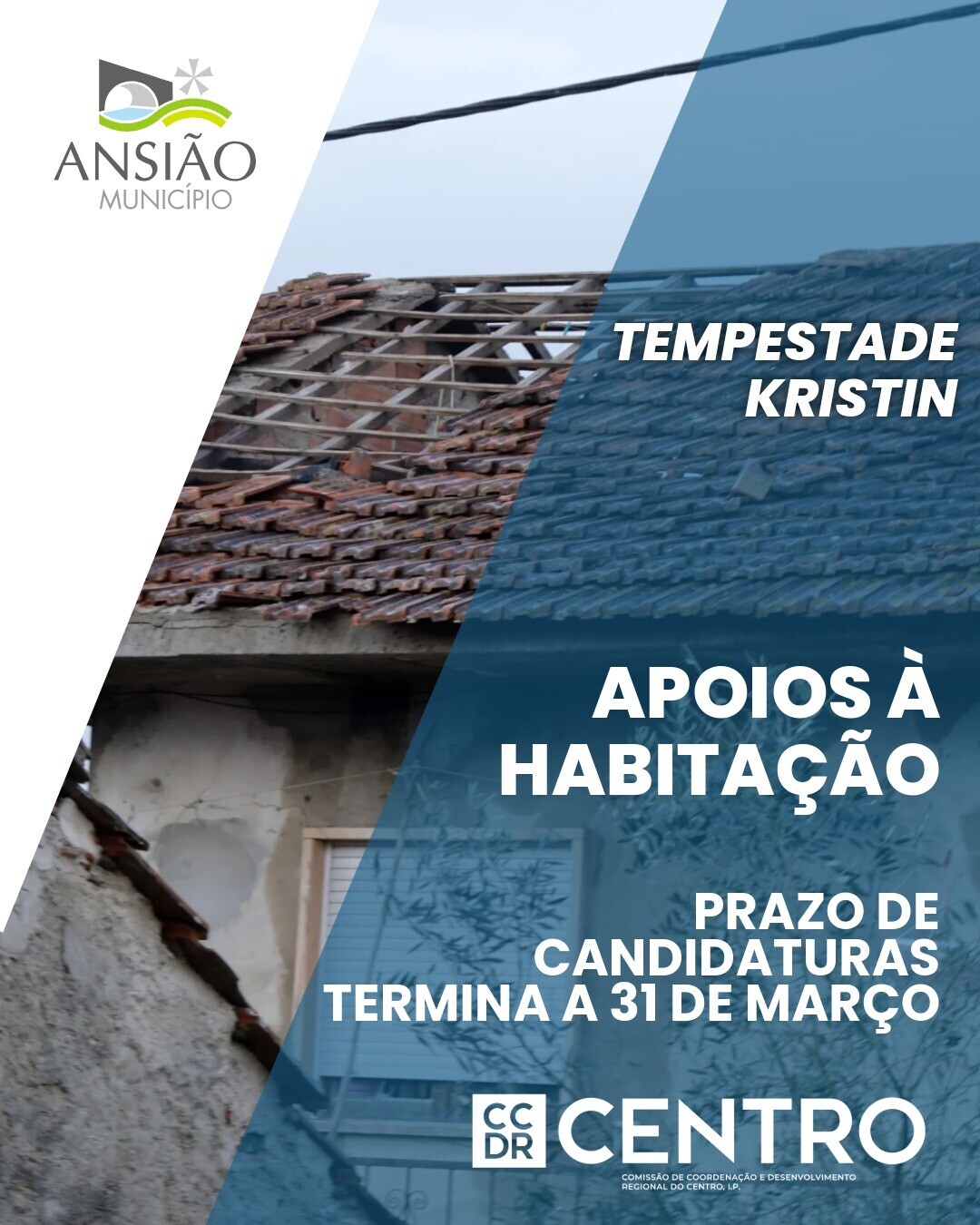 O período de candidaturas para apoio financeiro às habitações próprias e permanentes afetadas pela tempestade Kristin termina amanhã, dia 31 de março, conforme indicação da CCDR - Comissão de Coordenação e Desenvolvimento Regional do Centro.