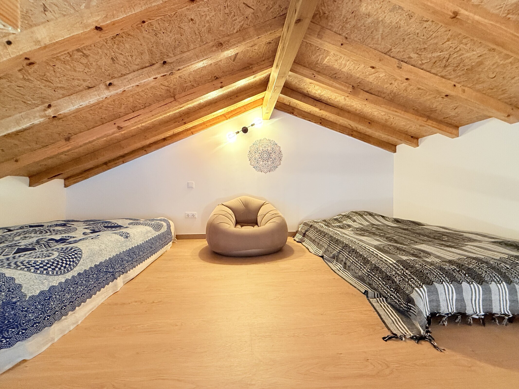 Tem 1 quarto de casal, um quarto com beliche de cama de casal e uma mezanine com 2 colchões de casal. Casa de banho, sala e cozinha totalmente equipadas com frigorífico, máquina de lavar louça, microondas e máquina de café.