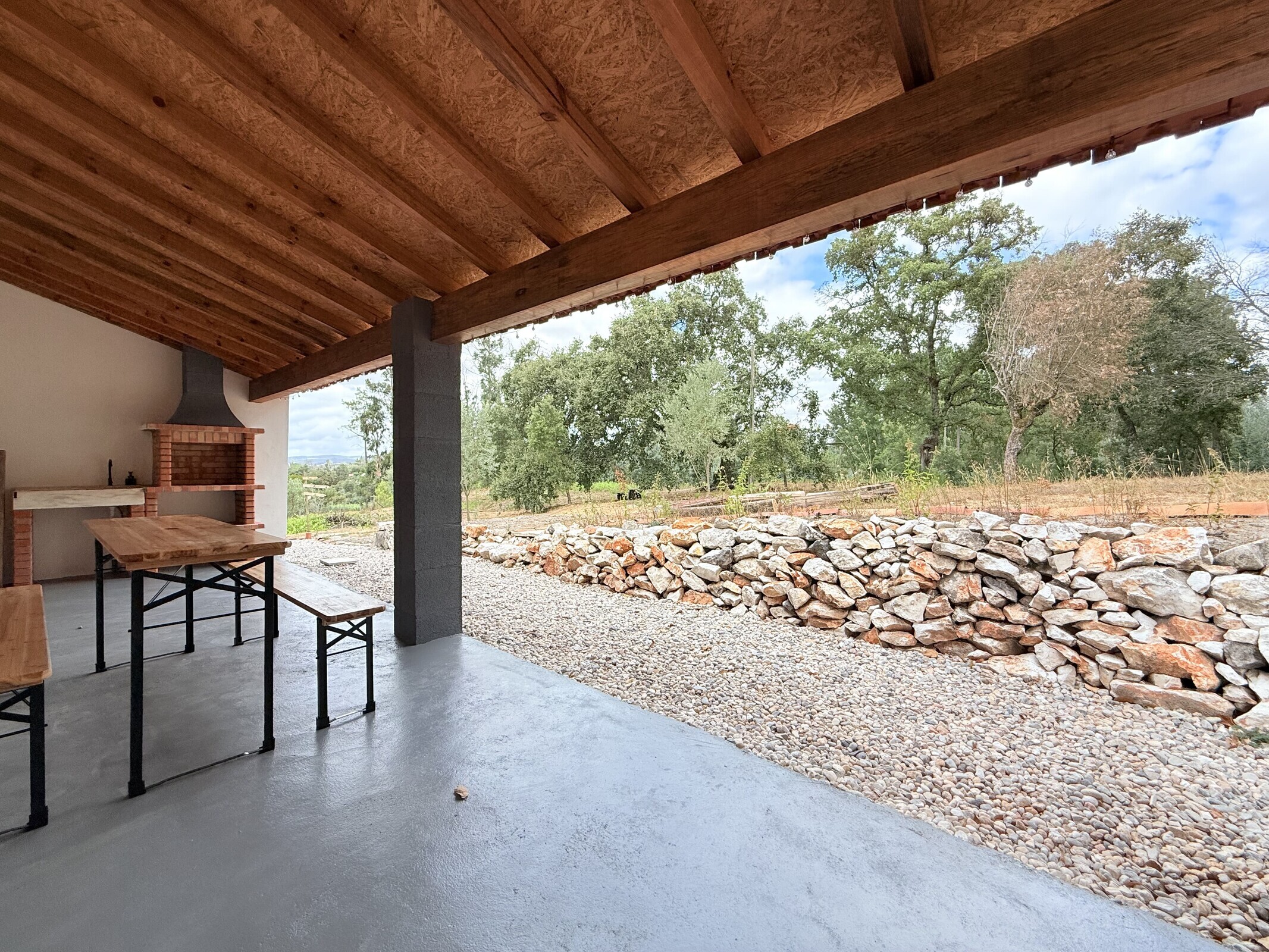 No exterior encontra uma zona de alpendre on existe a churrasqueira e mesa e bancos, um casa de banho e lavandaria.