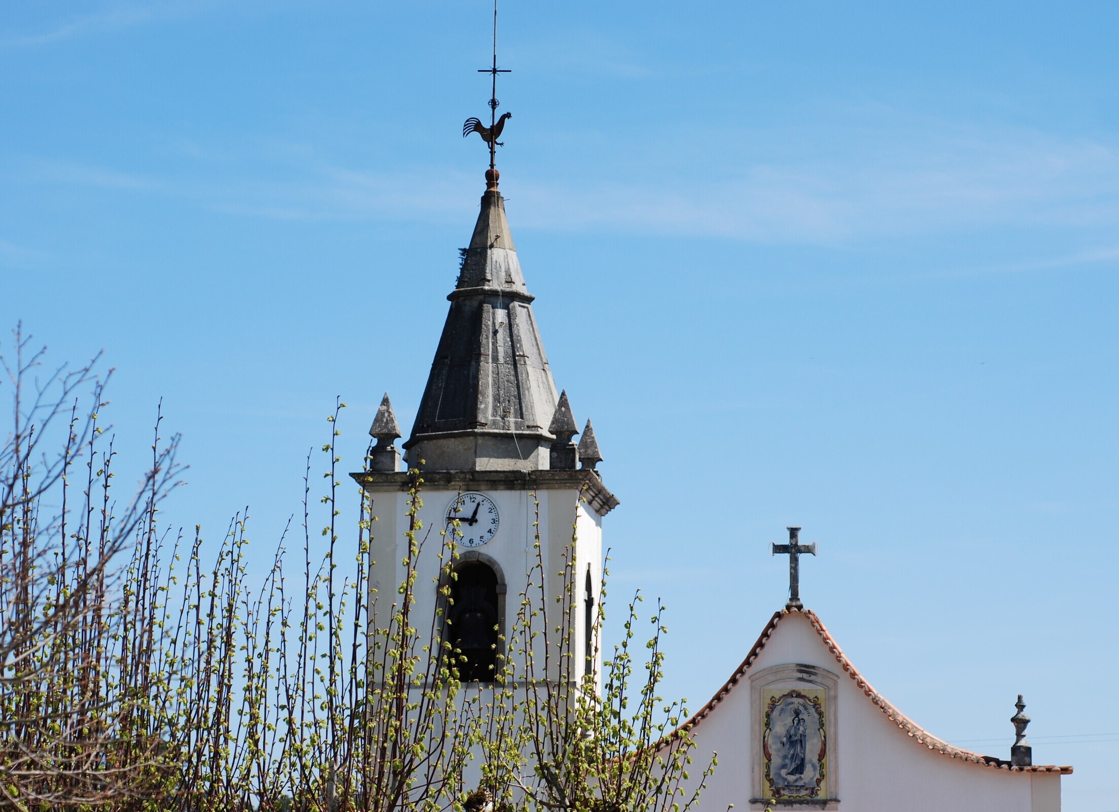 Do lado esquerdo do frontispício, está uma torre, com quatro arcos sineiros e mostradores do relógio a que se sobrepõe o tradicional coruchéu.